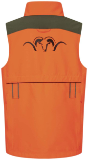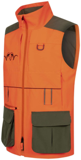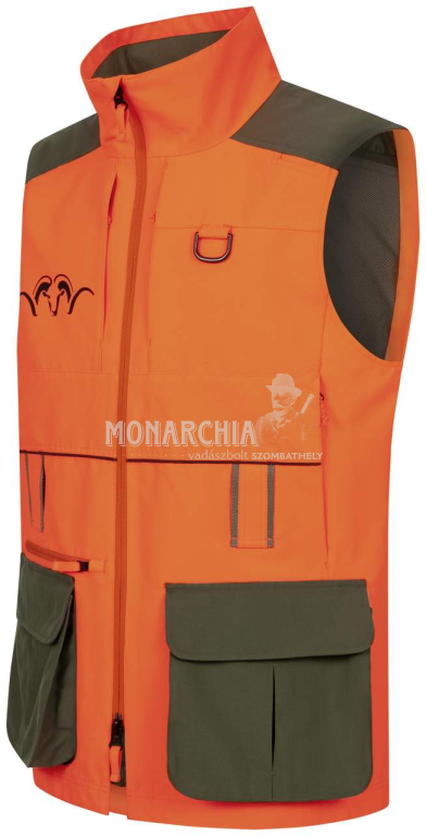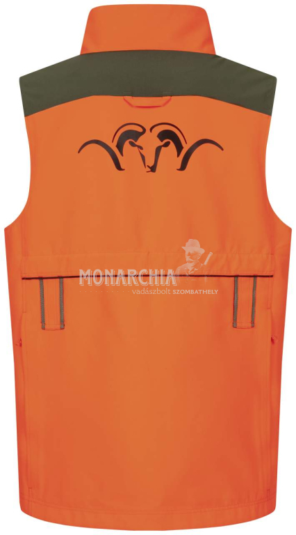 A Blaser Striker mellény narancssárga, magas láthatóságú színben készült, ami növeli a biztonságot a hajtó- és társasvadászatokon, mivel viselője könnyebben észrevehető a társak számára. Ez különösen fontos olyan helyzetekben, amikor több vadász és kutya mozog együtt a terepen. A mellény rendkívül praktikus zsebrendszerrel rendelkezik: elöl találhatók két rádiózseb antennakivezetővel, amelyek fekete, reflektáló Blaser „Argali” nyomattal vannak díszítve, valamint több, kontrasztos elrendezésű első zseb és belső hálós rekesz. Az oldalfalon található övek és hurkok lehetővé teszik többek között kutya póráz, mellövi vagy más felszerelés rögzítését. A hátoldalon egy különösen tágas nagy hátsó zseb található, amely mindkét oldalról könnyen hozzáférhető, kényelmesen zárható cipzárral. A Blaser Striker mellény úgy lett kialakítva, hogy ne csak a kutyavezetők igényeit szolgálja, hanem minden olyan vadász számára ideális legyen, aki szereti a rendezett, jól áttekinthető felszerelést és gyors hozzáférést minden szükséges kiegészítőhöz. A mellény funkcionális részletei és strapabíró anyaghasználata miatt hosszú távú vadászati használatra alkalmas, miközben a narancssárga szín a biztonsági szempontokat is kiemelten kezeli.