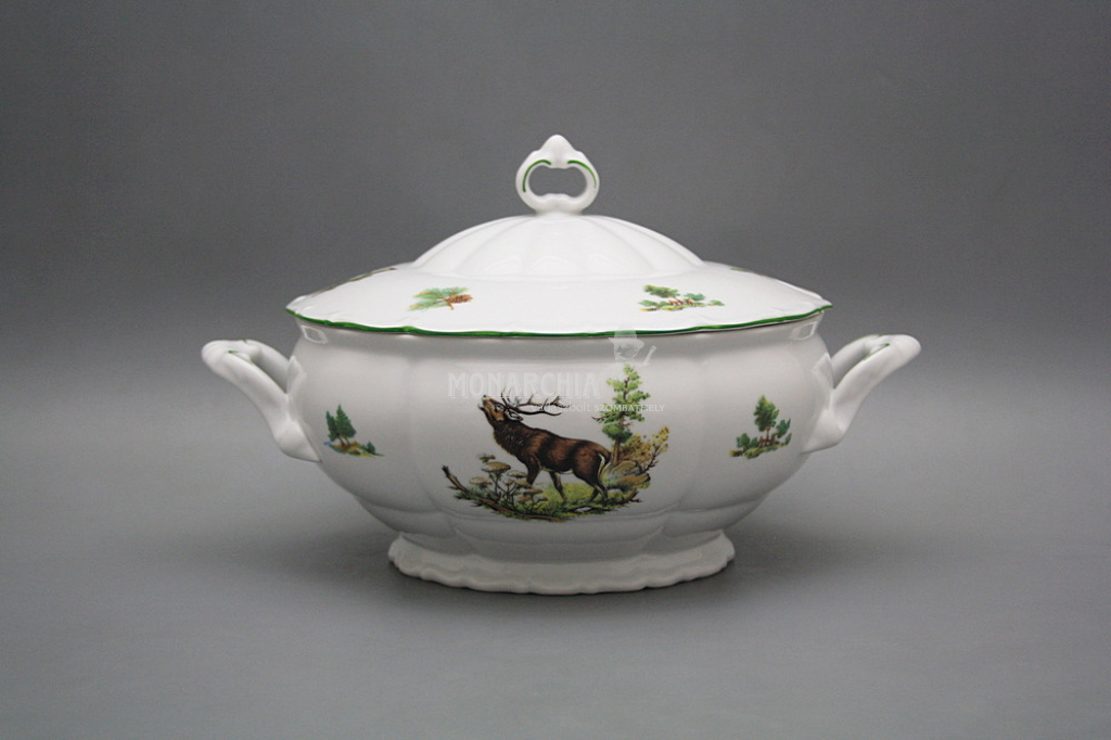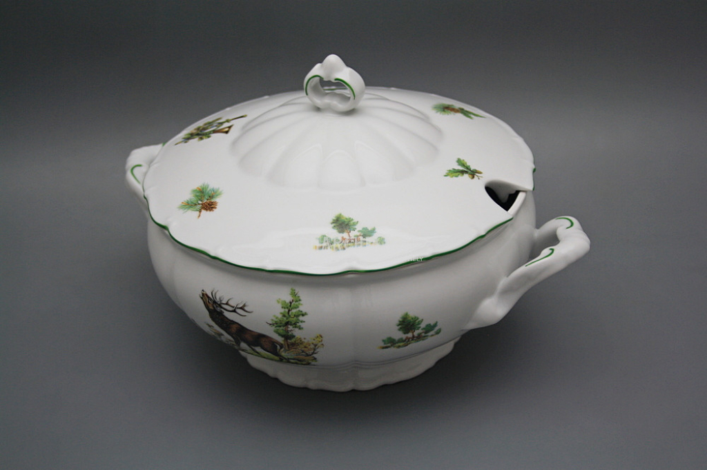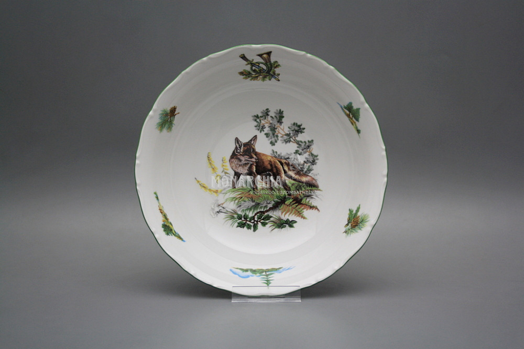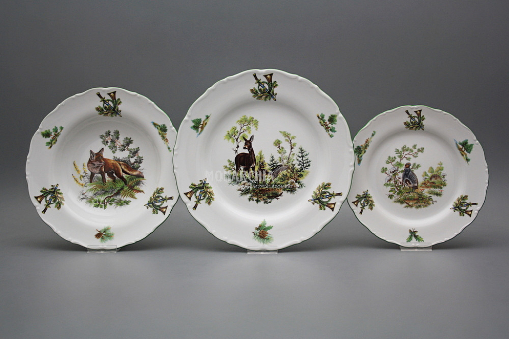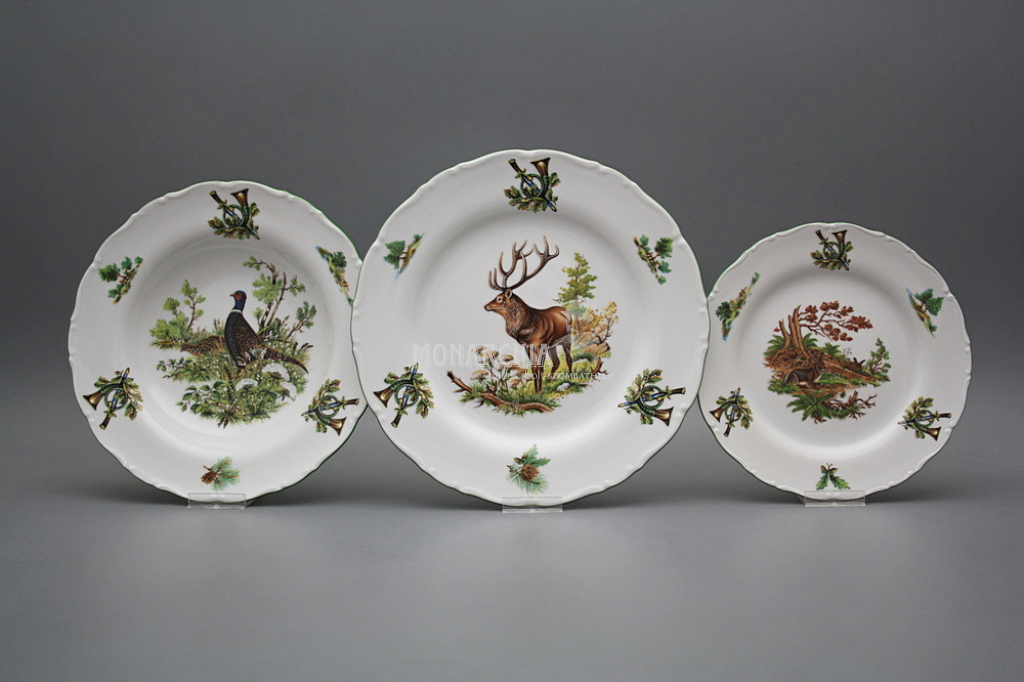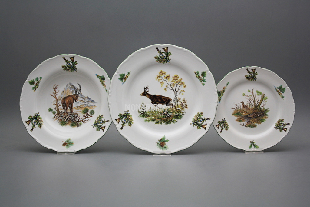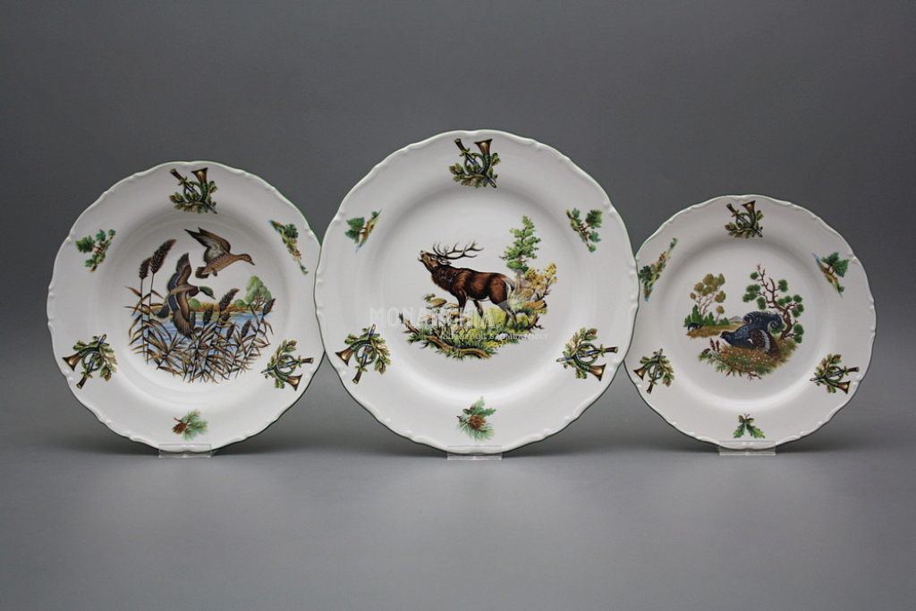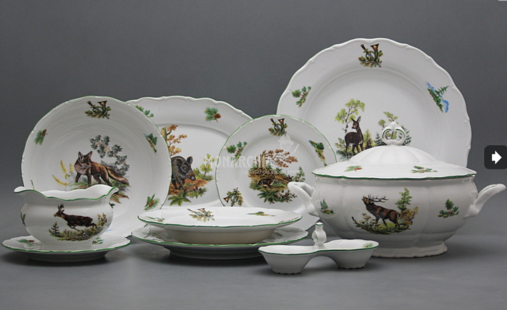 Gyönyörű, hagyományos étkészlet, gazdagon díszített vadászati motívumokkal. Praktikus, 26 darabos étkészlet, kiváló minőségű porcelánból. Mosogatógépben és mikrohullámú sütőben is használható. Tartalma: 1x 2,5 l-es leveses tál, 1x 0,4 l-es mártásos tál, 1x 170 mm-es alátét, 2x 23 cm-es mély tál, 1x 31 cm-es kerek lapos tál, 1x 32 cm-es ovális tál, 1x kétrészes sószóró, 6x lapos tányér 25 cm, 6x mély tányér 23 cm, 6x desszert tányér 19 cm. Különböző motívumokkal. Színgazdagsága egyedülálló, így a legigényesebb vásárlók igényeit is kielégíti. Gyönyörű ajándék. Ajánljuk például házassági évfordulóra, születésnapra, névnapra, vagy esküvőre.
