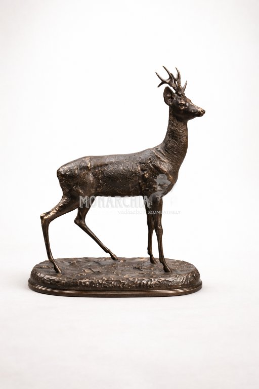 Ez az elegáns bronzszobor az őzbak nyugodt, mégis éber tartását örökíti meg, amikor az állat megáll, figyel, és uralja a környezetét. A karcsú testfelépítés, a finoman megformált lábak és az arányos agancs együttesen adják vissza az őz nemes, visszafogott karakterét, amely a vadász számára mindig különleges jelentéssel bír.