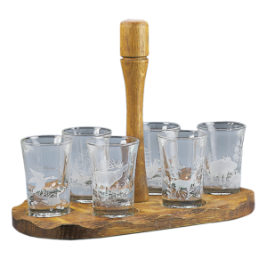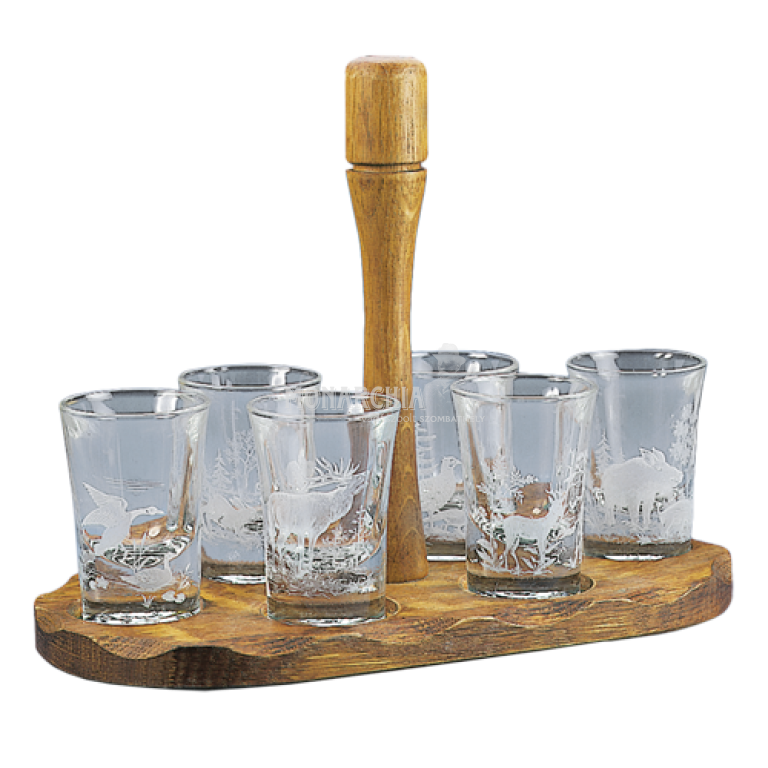 6 db 7 cm magas pohárral, tölgyfa deszkán, motívumok: szarvas, őz, vaddisznó, fácán, kacsa, nyúl